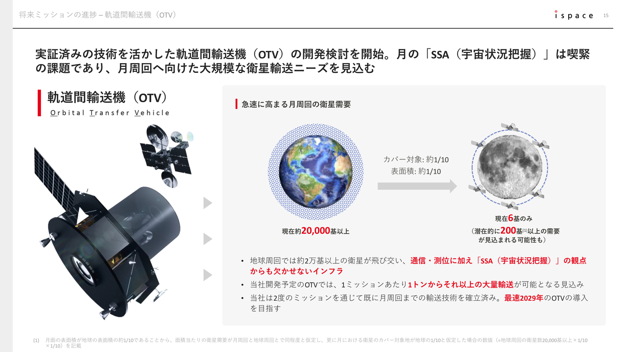 当社は、「OTV」の開発によって、一度に1トン以上のペイロードを月周回軌道まで効率的に輸送するサービスを提供し、当社の成長ドライバーの1つとすることを目指します。