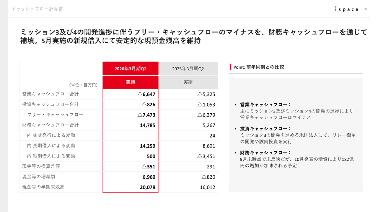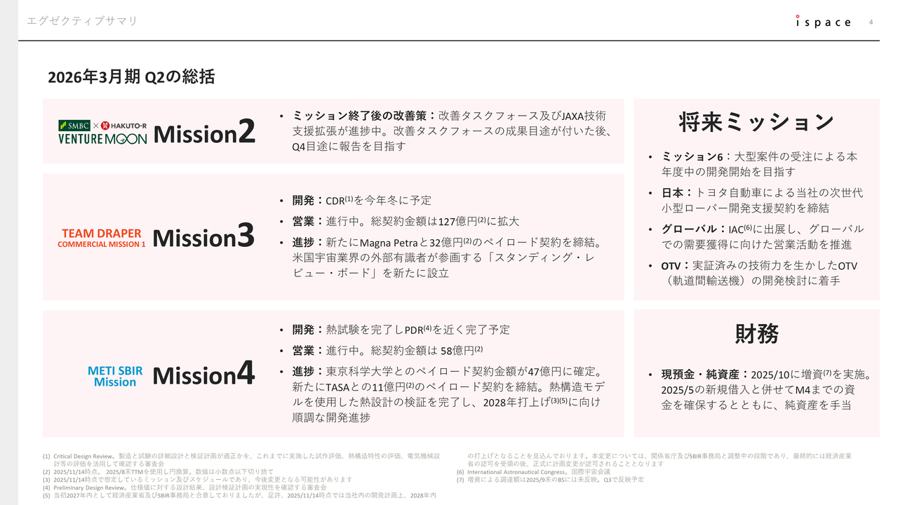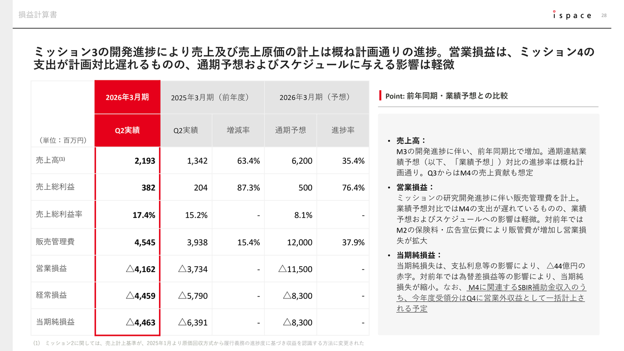 営業損益は、Mission 3の研究開発費が計上されたことにより、約41億円の営業損失を記録しました。業績予想対比では、主にMission 4の支出遅れの影響で、想定より営業損失は拡大していません。当該支出遅れは、あくまで支出タイミングのズレによるもので、下期に一定のキャッチアップが見込まれており、通期予想への影響は軽微と考えています。また、ミッションスケジュールの遅れに影響を与えるものではありません。