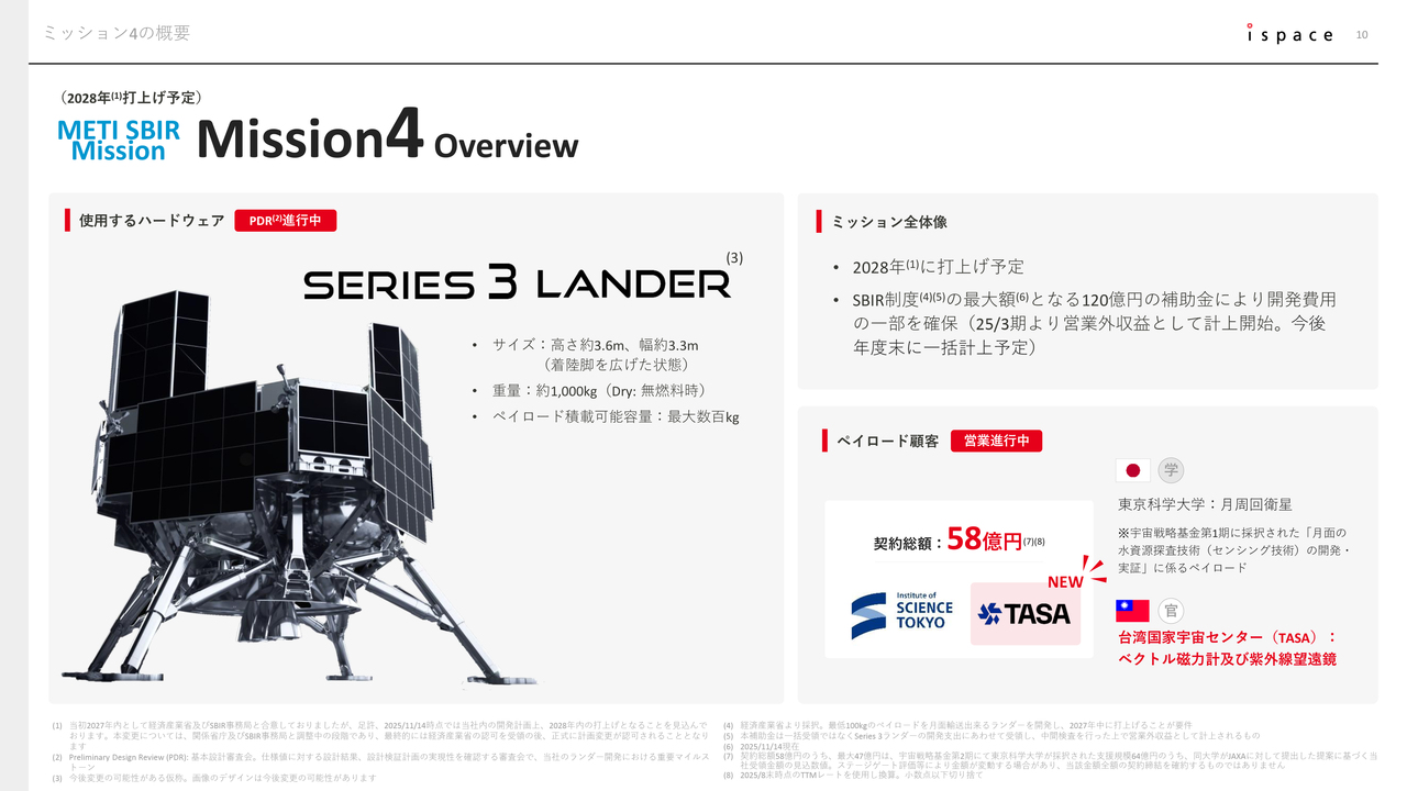 Mission 4についてです。こちらも営業面での進捗があり、現時点でMission 4のペイロード契約総額は58億円となっています。