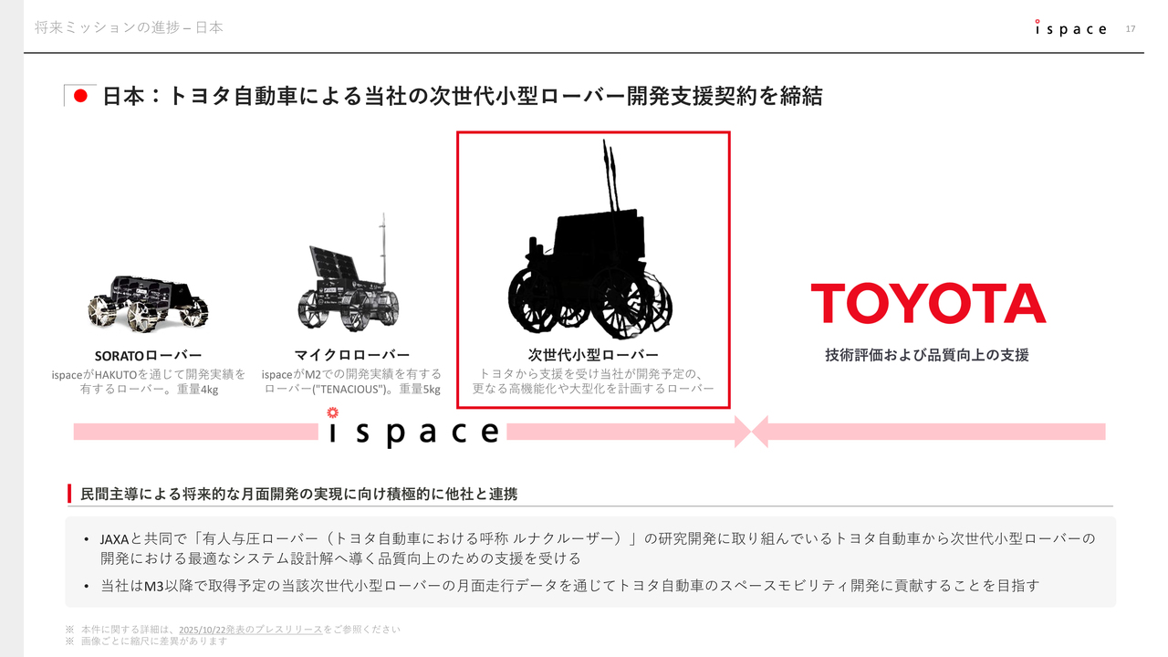 今回の契約締結により、当社はトヨタ自動車社から次世代小型ローバーの開発において、最適なシステム設計に向けた品質向上の支援をいただく予定です。また、当社からはMission 3以降で取得予定の月面データをトヨタ自動車社へ提供し、同社のスペースモビリティ開発に貢献していきます。
