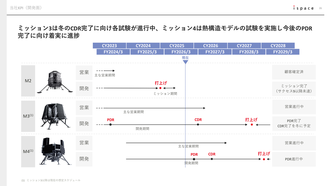 開発KPIの進捗については、これまでご説明したとおりです。Mission 3では今年冬のCDR(Critical Design Review:詳細設計審査会)完了に向けて各試験を進行中です。また、Mission 4では熱構造モデルを用いた熱真空試験を実施しており、今後のPDR完了に向けて着実に進捗しています。