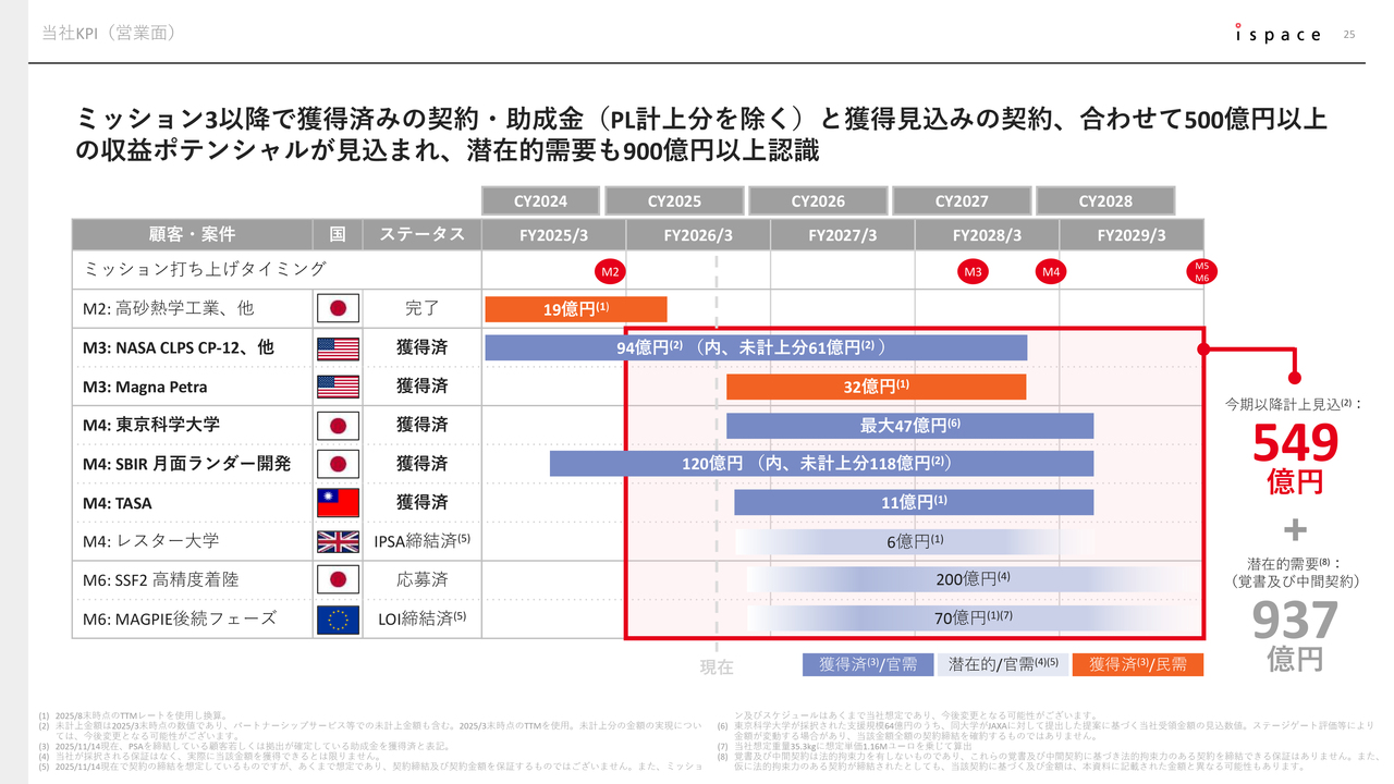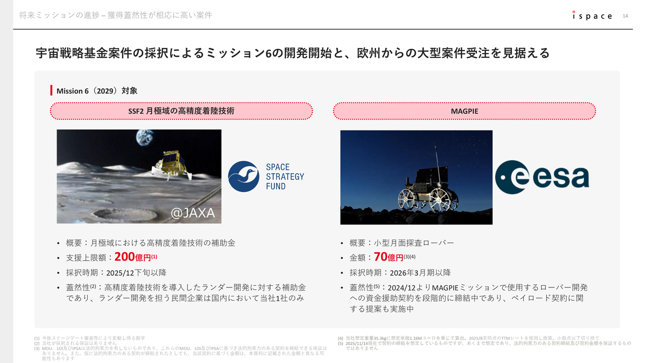 さらに、欧州においてはESA(欧州宇宙機関)と共同で小型月面探査ローバーの開発を進め、それを月に輸送する「MAGPIE」と呼ばれるプロジェクトが段階的に進行中です。最終的には同じくMission 6の売上として、総額70億円規模の契約を目指しています。