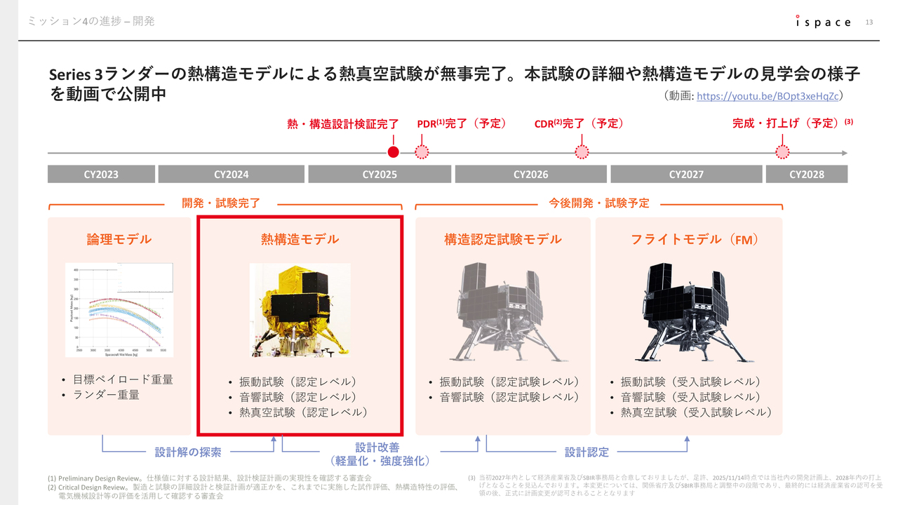 開発面では、「Series 3ランダー」の熱構造モデルを使用した熱真空試験が完了し、今後予定されているPDR(Preliminary Design Review:基本設計審査会)に向けて順調に進捗しています。