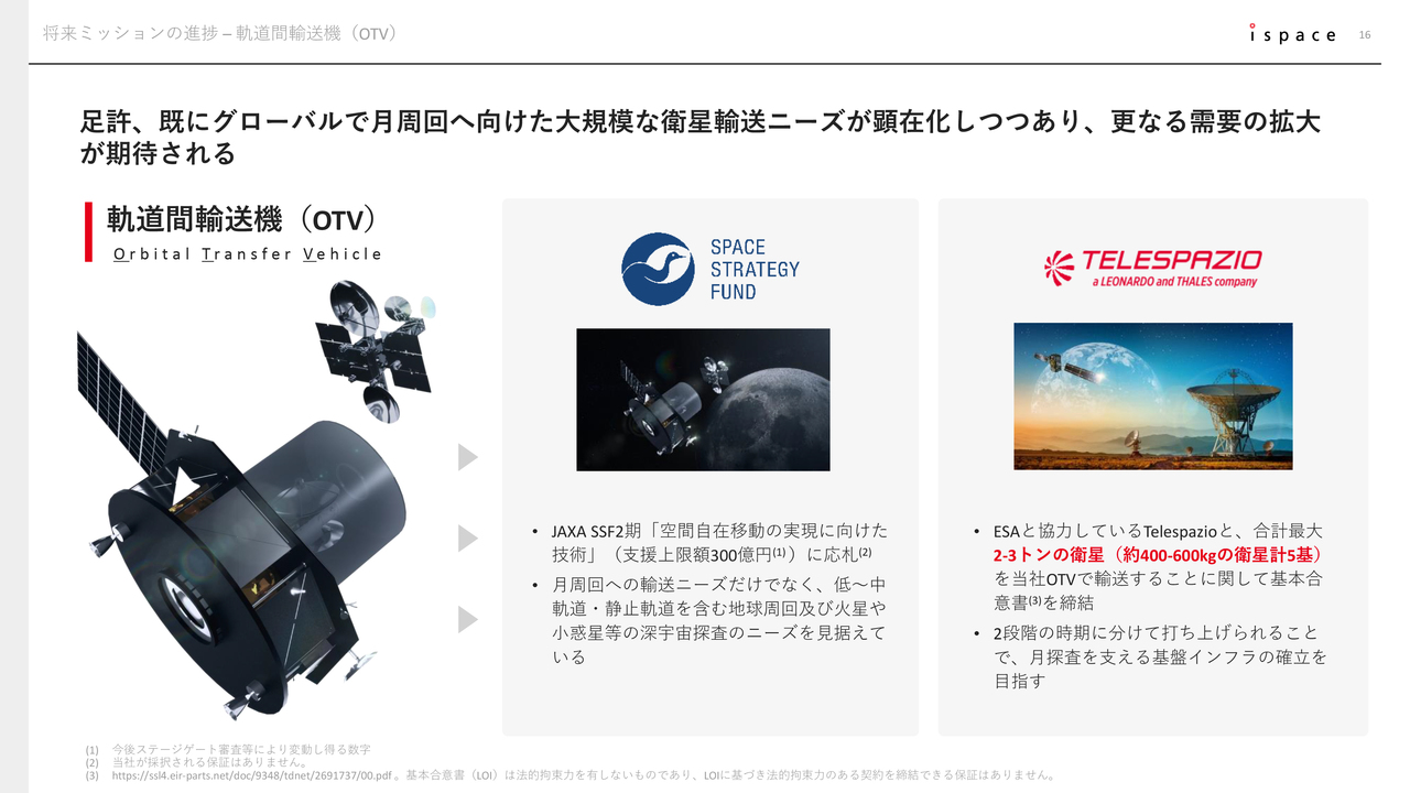 当社は、支援上限額300億円の宇宙戦略基金第2期における「空間自在移動の実現に向けた技術」というテーマに応札しています。また、イタリアのTelespazio社とは、約2から3トンの大型衛星を月周回軌道へ輸送するための基本合意書を締結しました。