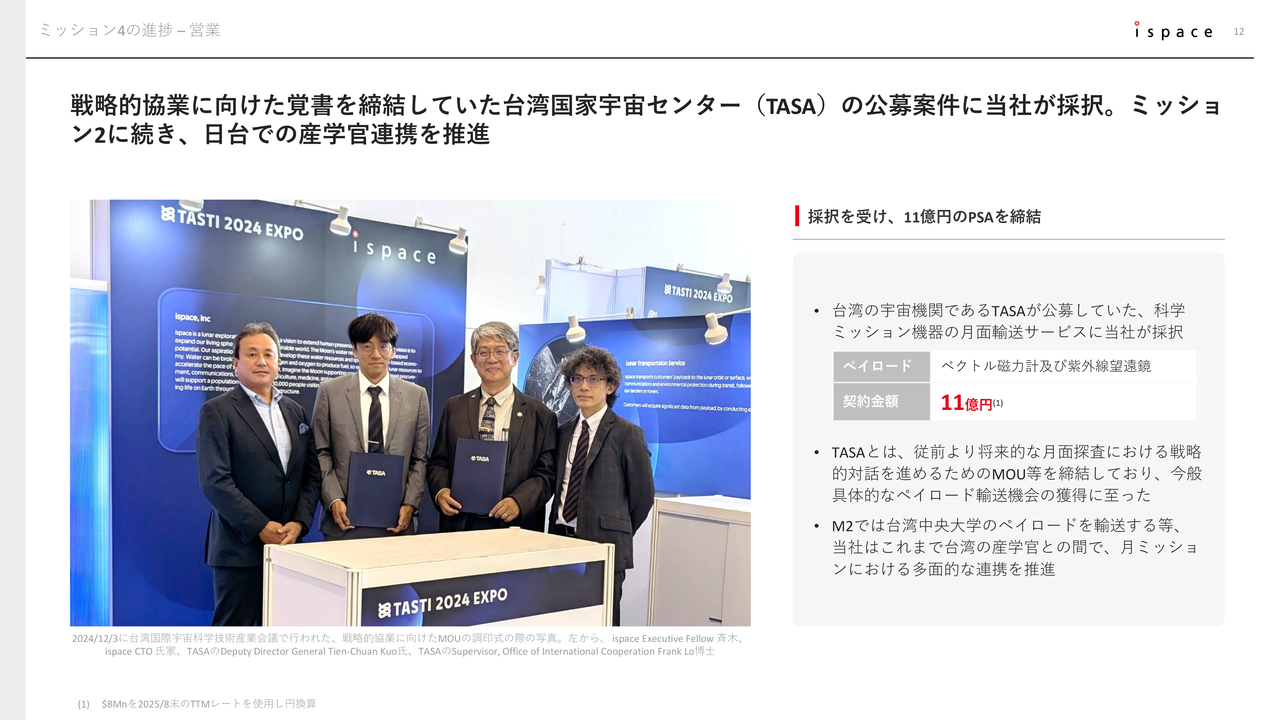 直近のアップデートとして、公募に応札していた台湾国家宇宙センター(TASA)の案件において、当社が採択され、11億円のペイロードサービス契約を締結しました。