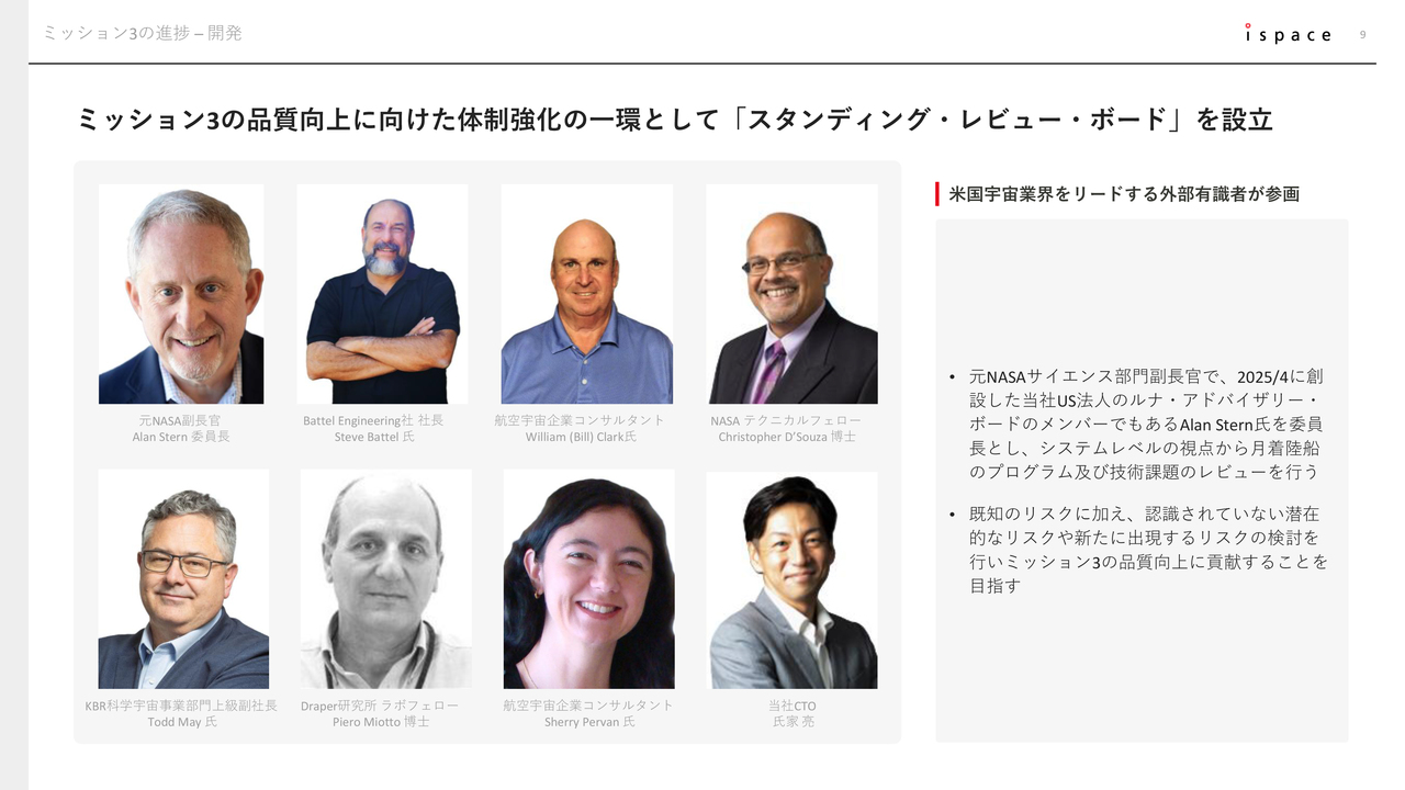 開発面では、米国宇宙業界を代表する外部有識者が集まり、当社のミッションや技術課題のレビューを行う会議体「スタンディング・レビュー・ボード」を新たに設立しました。Mission 3の成功に向けて、技術クオリティの向上に努めていきます。