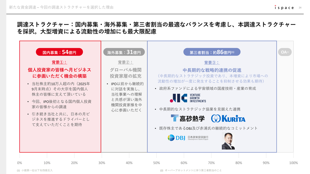 今回の増資のストラクチャーについて、182億円の新規調達の約30パーセントにあたる54億円を、個人投資家を中心とする国内のみなさまから出資いただきました。