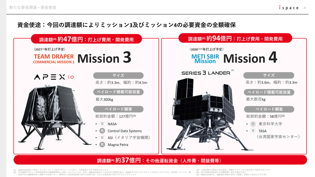 資金使途としては、182億円のうち47億円を2027年打ち上げ予定のMission 3、94億円を2028年打ち上げ予定のMission 4の必要資金に充て、37億円をその他運転資金に充てる予定です。これにより当社は、Mission 3、Mission 4の開発資金を全額確保しました。