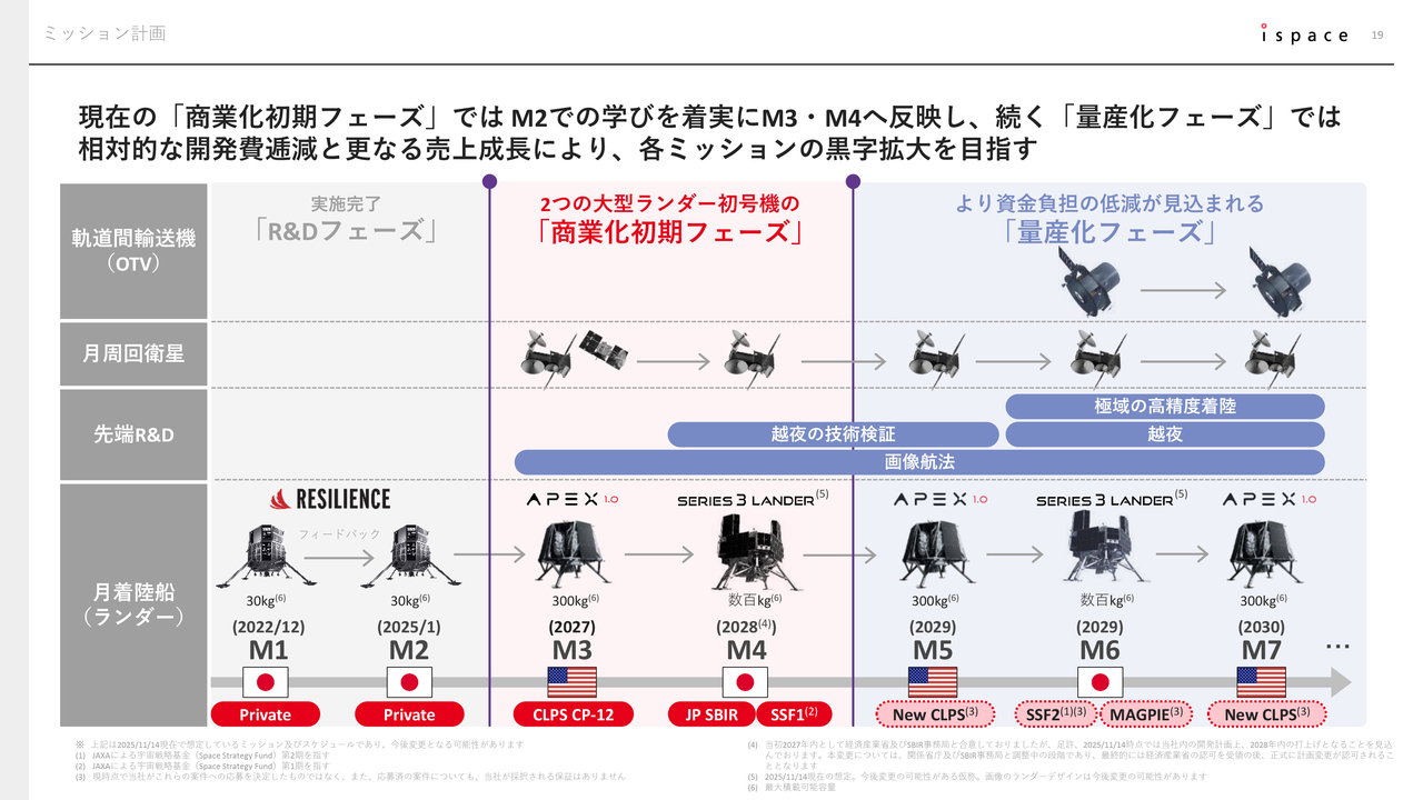 将来ミッションの進捗についてご説明します。当社は日本において、宇宙戦略基金第2期のテーマの1つである「月極域の高精度着陸技術」における支援上限額200億円の補助対象事業への応札を行っており、この採択発表の確定時期は本年年末から翌年1月となっています。採択が確定した場合、こちらは当社のMission 6として位置付けられる予定です。