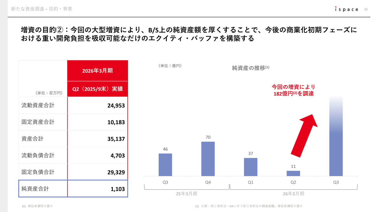 このバランスシート上のエクイティを厚くし、債務超過などのリスクを回避することがこれまでの決算発表等でもお伝えしてきたとおり、会社として取り組みたいことでした。今回の182億円の調達で、エクイティバッファーをしっかりと積み上げることができたのが、1つ目の大きな理由です。