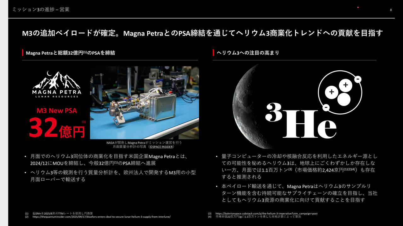 Mission 3についてです。営業面で大きな進捗がありました。新たに、月面でのヘリウム3同位体の商業化を目指す米国のMagna Petra社と、32億円のペイロードサービス契約を締結しました。これにより、Mission 3の契約総額は95億円から127億円に増加しました。