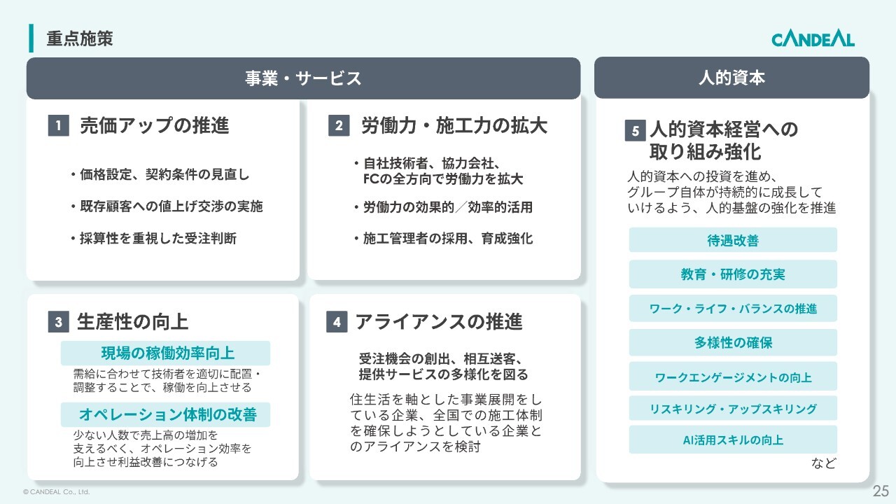 全体としては、物価の上昇に伴う値上げ交渉の推進を重点施策として捉えています。労働集約型の事業を営む当社グループにとって、最大の懸念材料は、建設コストや労務単価の急激な上昇です。労働力の確保を維持するためにも、これらの課題への適切な対応は非常に重要です。