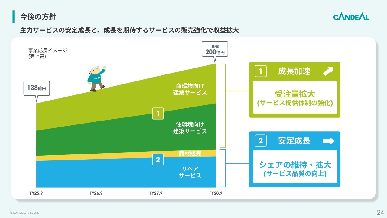 商環境向けと住環境向け建築サービスは成長加速の柱とします。サービス提供体制を強化するため、施工体制を拡大するとともに、オペレーション体制の改善や営業力の強化で需要を確実に取り込みます。