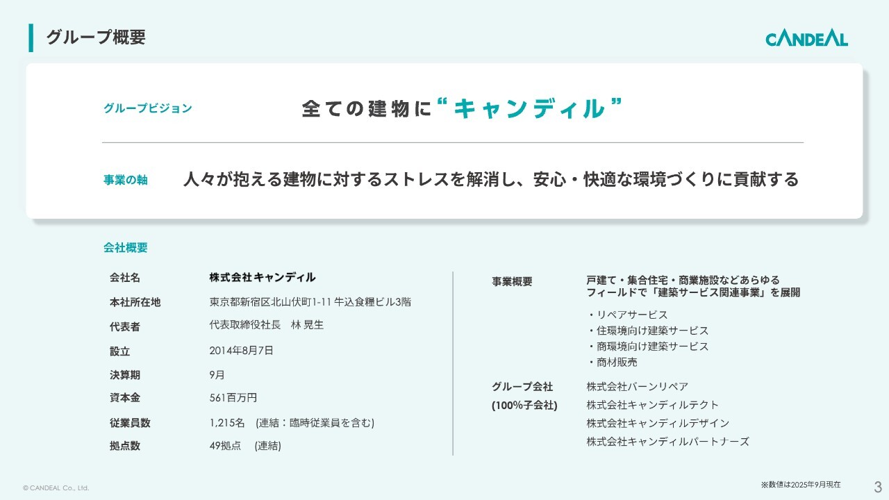 林晃生氏:みなさま、こんにちは。株式会社キャンディル代表取締役社長の林です。本日は、お忙しい中、2025年9月期通期の決算説明をご視聴いただき、誠にありがとうございます。
