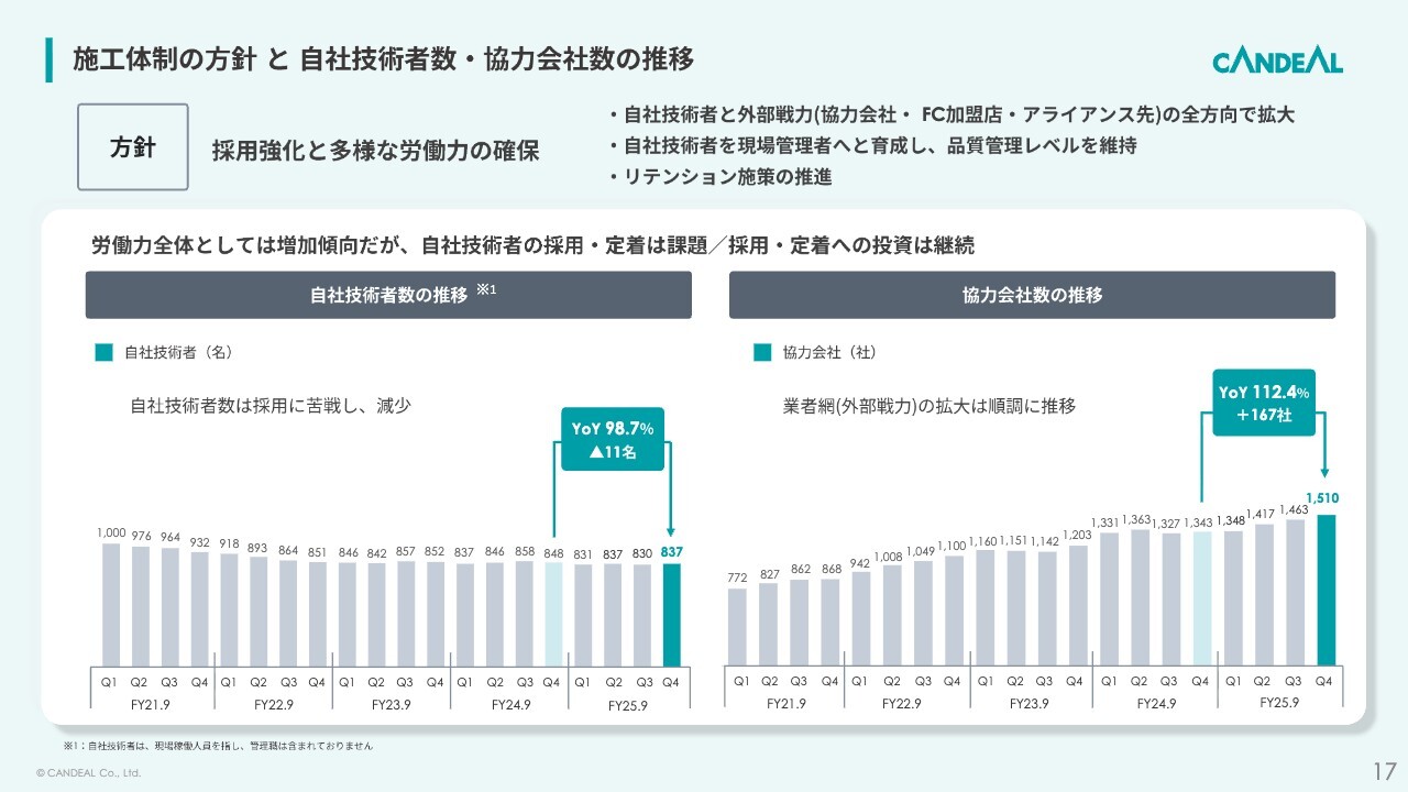 この状況は維持させつつも、自社技術者の採用・育成も引き続き強化し、内部戦力と外部戦力ともにバランスをとりながら拡大させていきます。特に、施工管理者の採用強化・育成強化は重要な施策です。