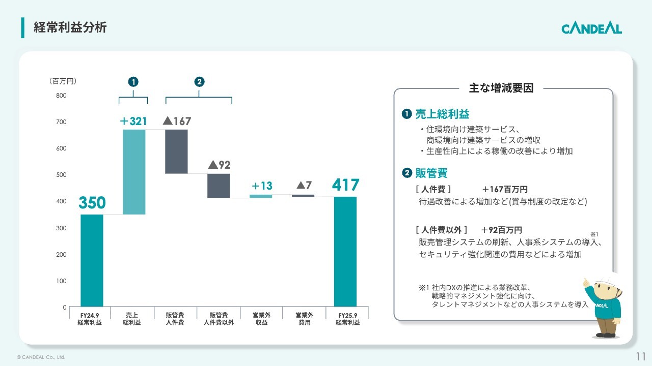 売上総利益は、住環境向け建築サービスと、商環境向け建築サービスの売上高が順調に伸びたことや、生産性の向上による稼働の改善により前期と比べ3億2,100万円の増益となりました。
