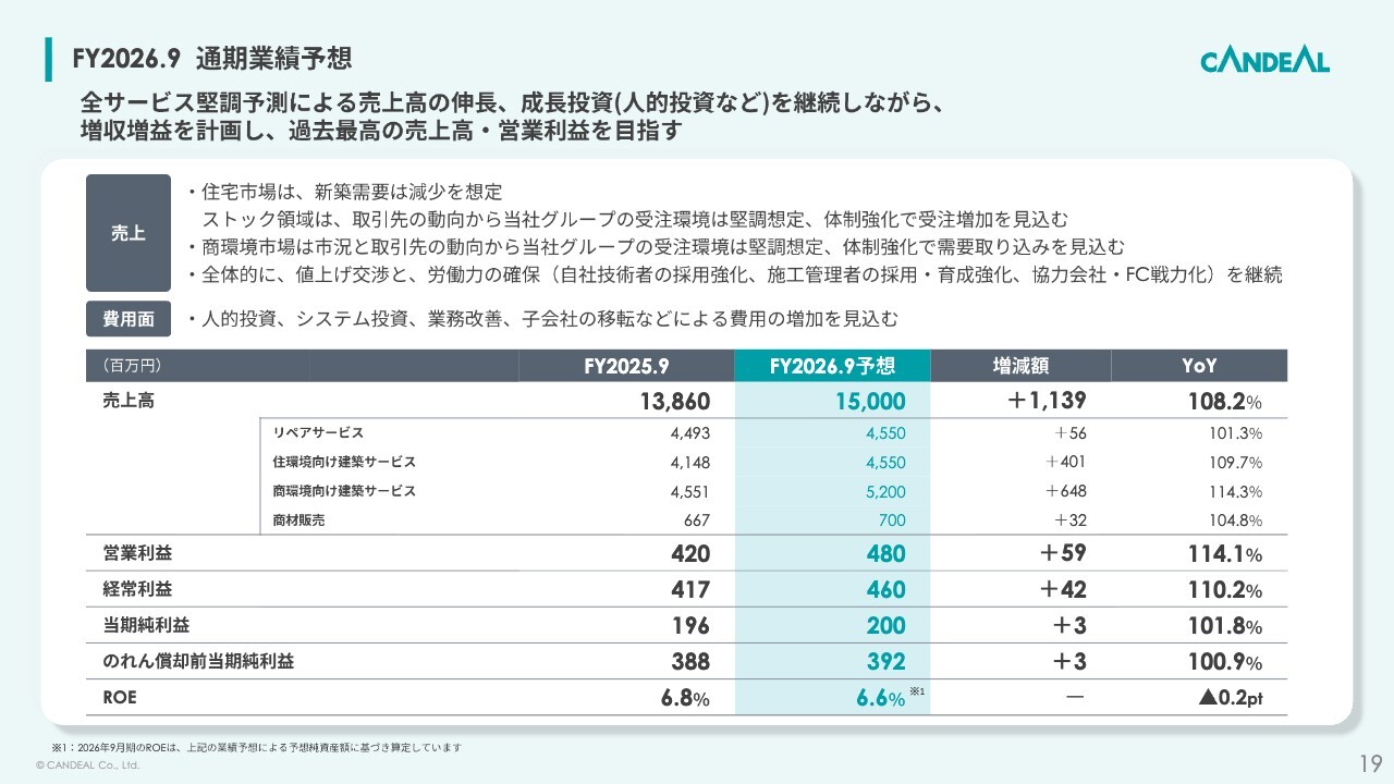 2026年9月期の見通しについては、新築住宅向けサービスの市場に陰りが見えるものの、需要は引き続き堅調に推移すると予測しており、過去最高の売上高、営業利益を見込んでいます。