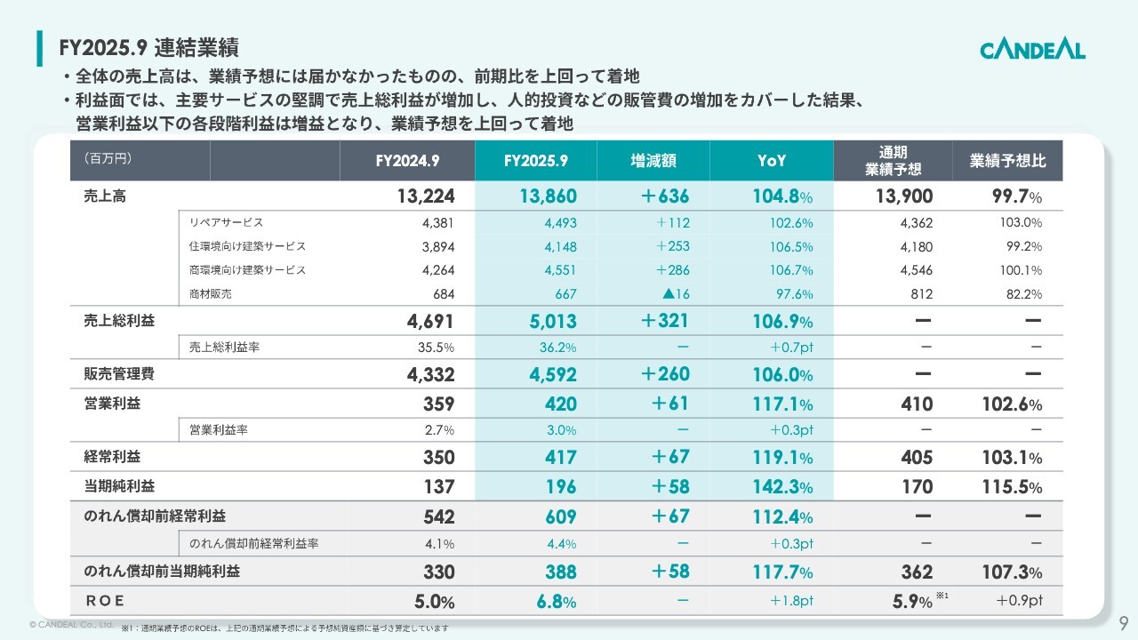 2025年9月期通期の連結業績は、売上高、前期比104.8パーセントの138億6,000万円、営業利益は、前期比117.1パーセントの4億2,000万円、のれん償却前経常利益は、前期比112.4パーセントの6億900万円となり、増収増益で着地しました。
