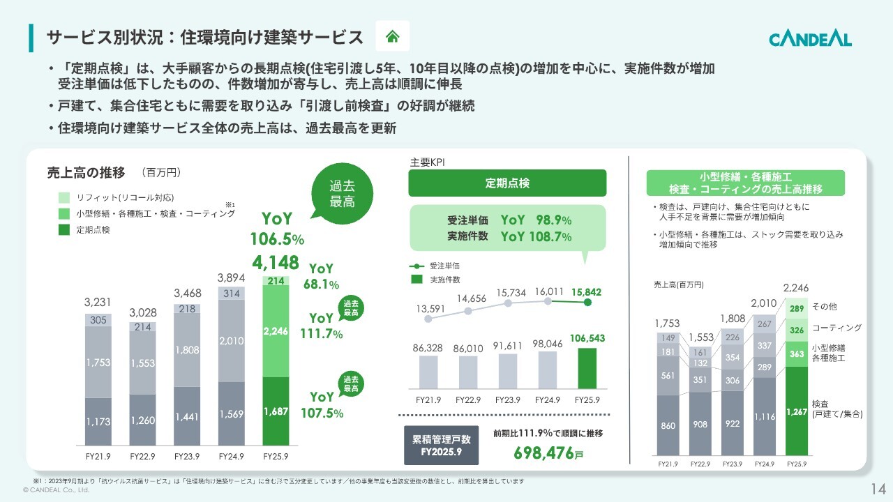 定期点検については、実施件数が前期比108.7パーセント、受注単価が、前期比で98.9パーセントとなり、売上高は前期比107.5パーセントと伸長しました。住宅引渡し後の5年目、10年目以降に実施する「長期点検」を大手顧客から大量受注したことによってボリュームディスカウントが発生し、受注単価は押し下げられましたが、件数の増加が寄与し、売上高は大幅に増加しました。
