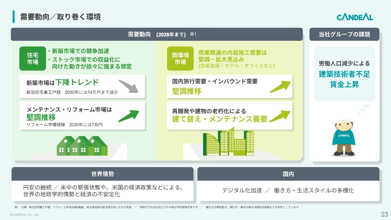 市場環境についてですが、主力のリペアサービスや住環境向け建築サービスに影響する住宅市場では、新設住宅着工戸数が2030年に向け下降トレンドが続く見込みです。
