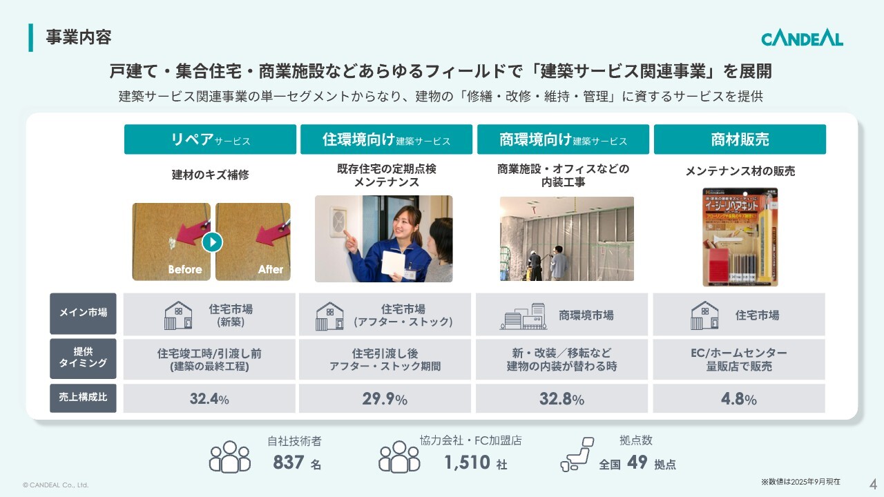 4つ目は商材販売で、リペア・メンテナンス商材をホームセンターやECサイトで販売し、プロから一般ユーザー双方のニーズに応えています。
