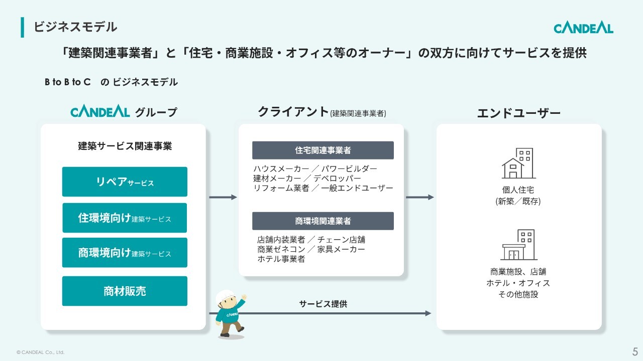 ビジネスモデルは、BtoBtoC型で、内装工事業者、ゼネコン、商業ゼネコン、ハウスメーカー、パワービルダー、建材メーカー、家具メーカーなどの建築関連事業者からご依頼を受け、当社グループの技術者がエンドユーザーのご自宅などの現場にお伺いして、サービスを提供するスタイルです。