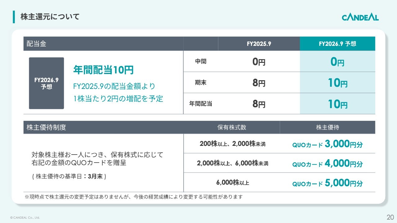 株主還元についてご説明いたします。まず、2026年9月期の配当予想についてですが、2025年9月期同様、期末配当のみで、1株当たり、10円とし、2025年9月期の配当金額より2円の増配を予定しています。
