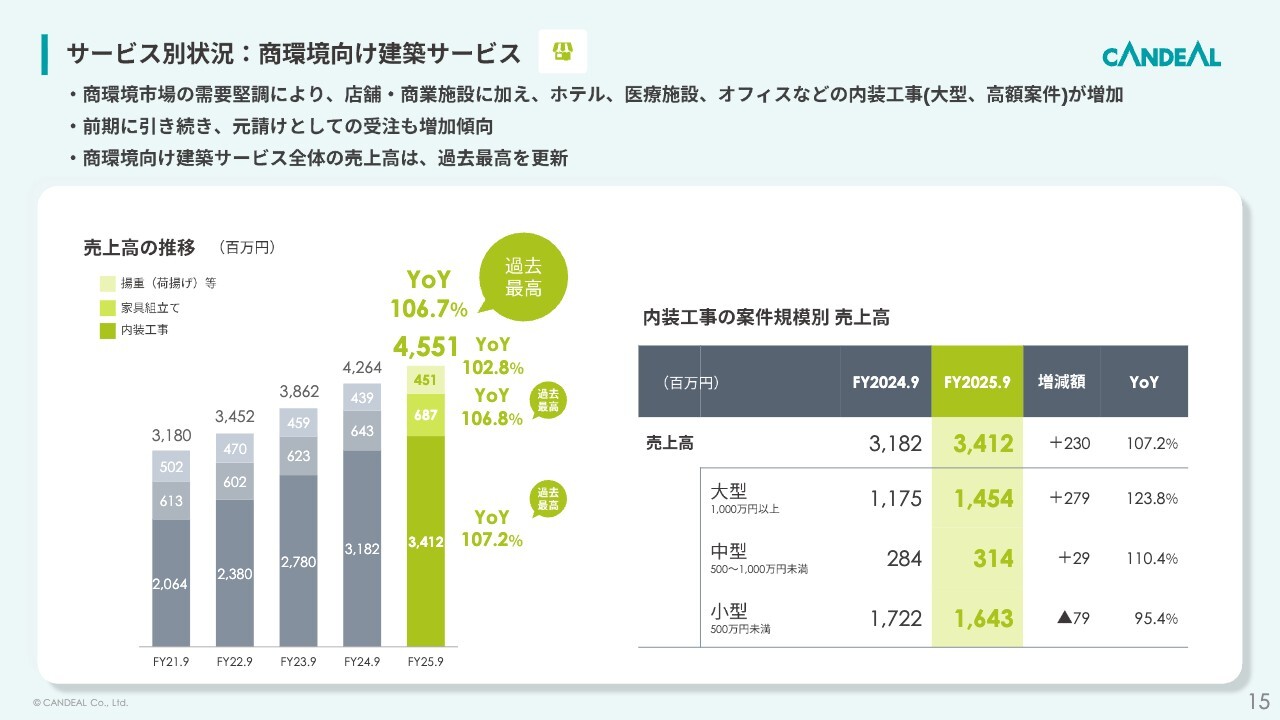 また、内装工事だけでなく、家具量販店からの組立て案件も増加傾向にありました。案件規模別にみると、大型案件の増加が顕著で、1件の受注単価も上昇しました。具体的には、ホテル、オフィス、医療施設などの案件が増加しています。