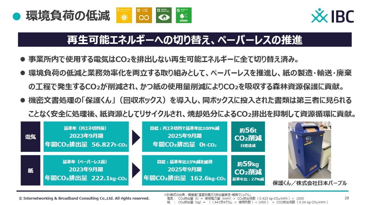 2つ目は、環境負荷の低減についてです。当社は、事業所内で使用する電力をすべて再生可能エネルギーに切り替えました。さらに、ペーパーレス化を推進し、環境負荷の低減に積極的に取り組んでいます。