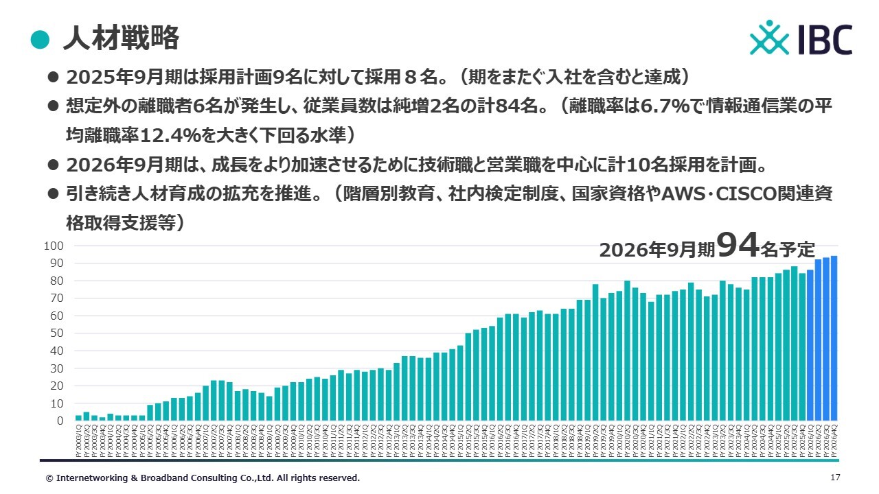 人材戦略についてです。2025年9月期は、9名の採用計画に対し8名の採用となりました。ただし、期をまたいだ入社を含めると、採用人数は計画どおりとなります。一方、想定外の離職者が6名発生し、純増は2名となりましたが、離職率は業界平均を大きく下回る水準を維持しています。