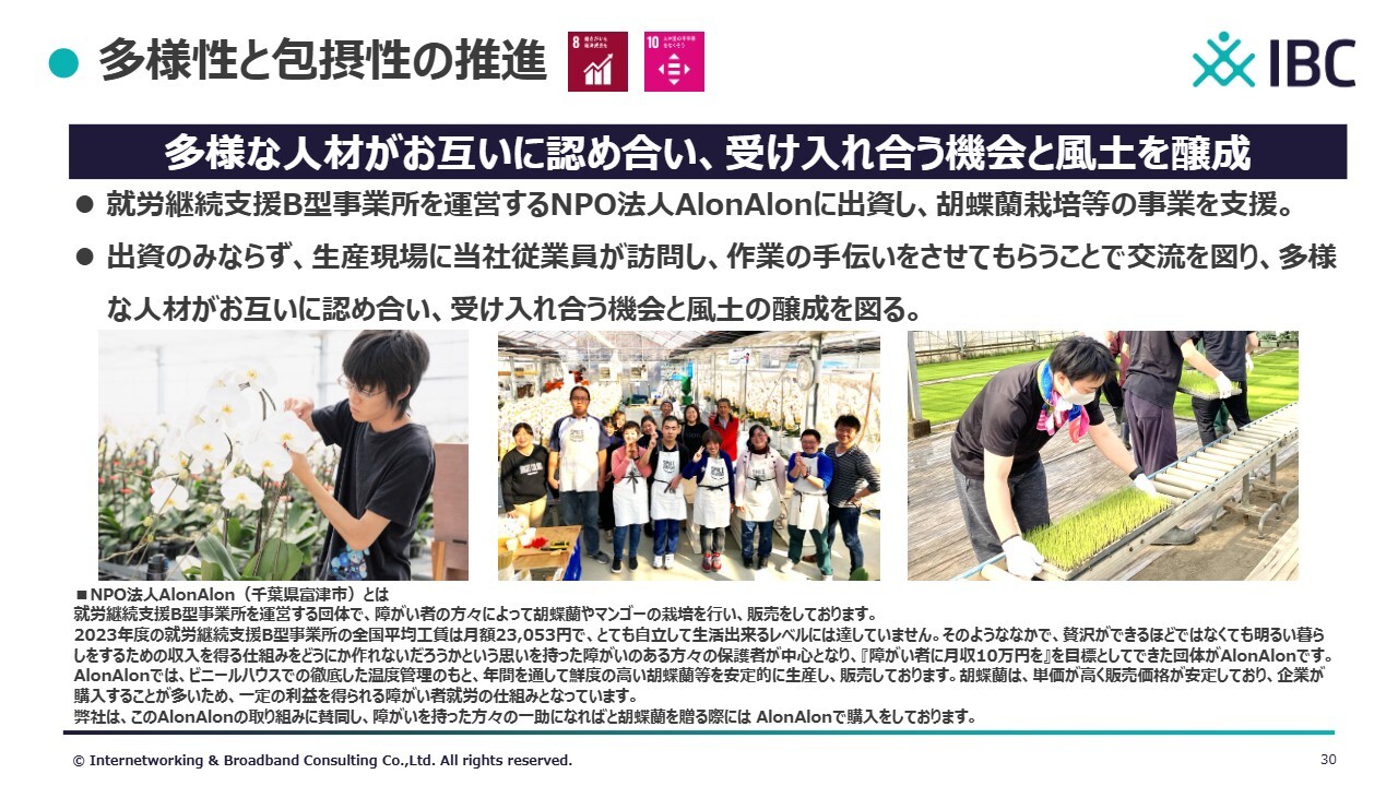 3つ目は、多様性と包摂性の推進についてです。当社はNPO法人AlonAlonに出資し、胡蝶蘭栽培などの事業を支援しています。生産現場に当社従業員が訪問し、作業を手伝うことで交流を図っています。このような活動を通じて、社員一人ひとりが他者を思いやる優しさを育みながら、持続可能な社会の実現に貢献していきます。