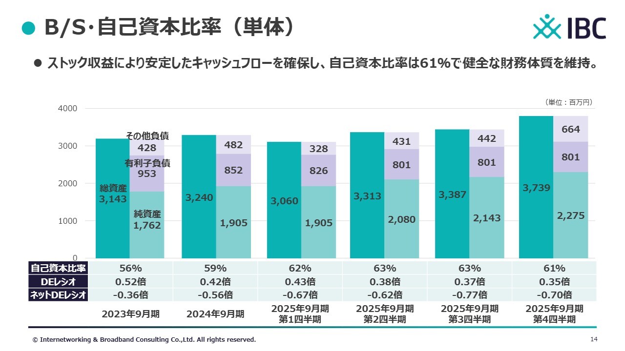 バランスシートおよび自己資本比率についてです。ストック収益により安定したキャッシュフローを確保し、自己資本比率は61パーセントとなりました。健全な財務体質を維持しています。