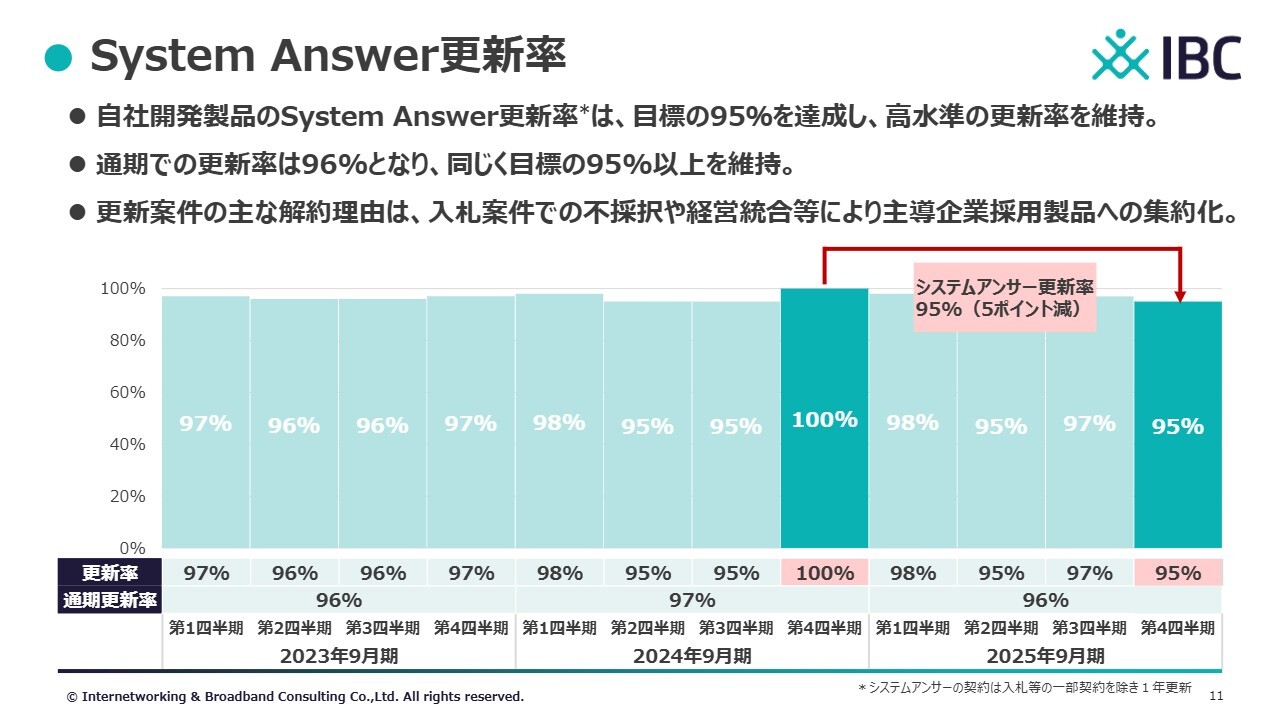 当社の主力製品である「System Answer」の更新率は96パーセントとなり、目標としていた95パーセントを超え、高水準で推移しました。