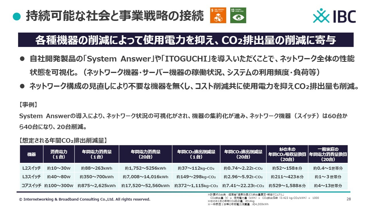 持続可能な社会への取り組みについてお話しします。1つ目は、持続可能な社会と事業戦略の接続についてです。「System Answer」や「ITOGUCHI」を利用いただくと、ネットワーク機器の性能状況の監視に加えて、それぞれの機器の性能情報やネットワーク構成情報を基に不要な機器を精査することができ、機器の削減によって運用コストの軽減が図れます。また、CO2削減も可能です。
