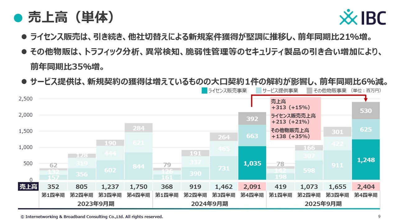 単体の売上高についてです。主力のライセンス販売事業は、他社からの切り替えによる新規案件獲得が引き続き堅調に推移し、前年同期比21パーセント増の12億4,800万円となりました。