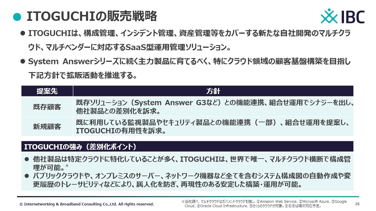 新製品「ITOGUCHI」の販売戦略についてです。「System Answer」シリーズに続く主力製品として育てることを目指し、特にクラウド領域で顧客基盤の構築を進めていきます。