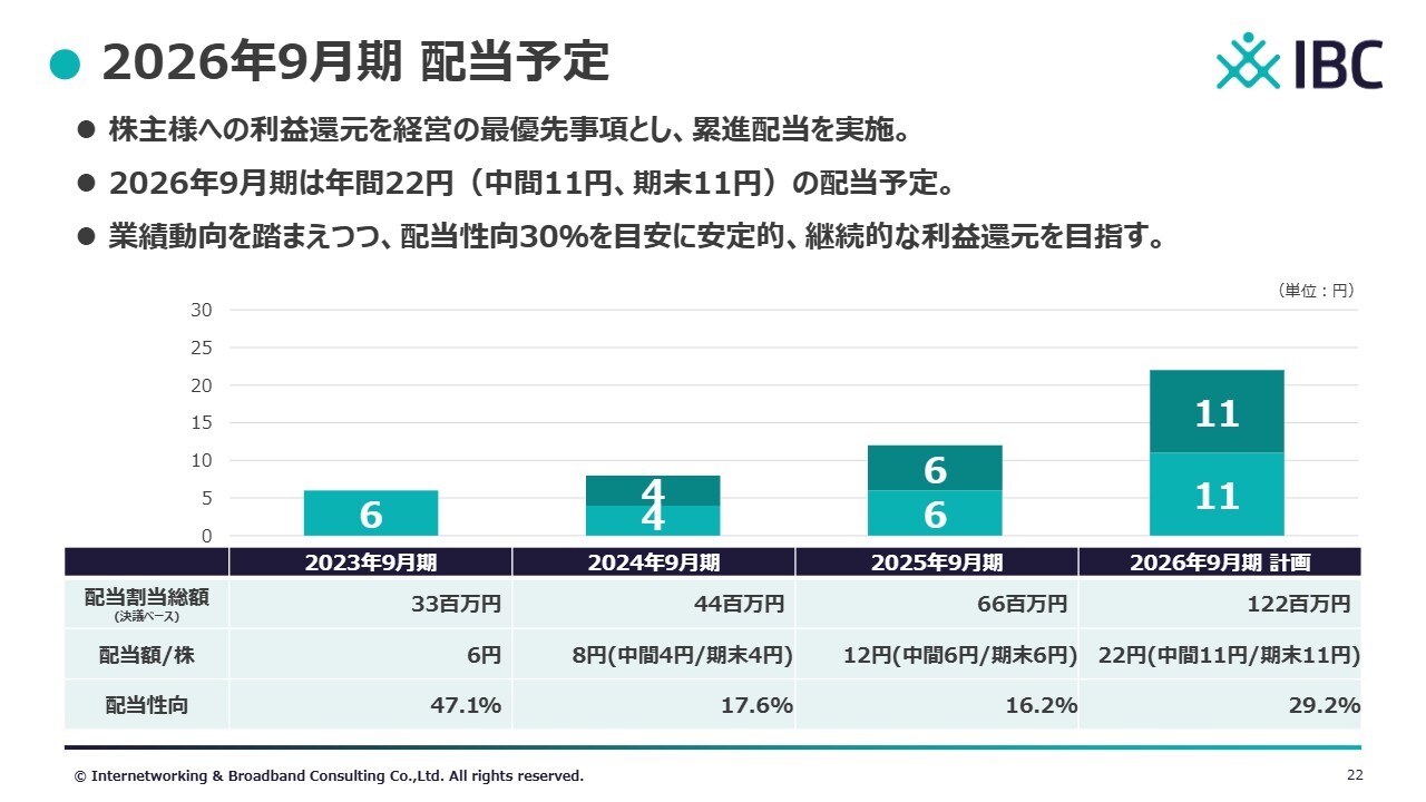 2026年9月期の配当についてです。中間配当を11円、期末配当を11円とし、年間では22円、前年同期比で10円の増配を予定しています。業績動向を踏まえた上で、配当性向30パーセントを目安に、安定的かつ継続的な利益還元を目指していきます。