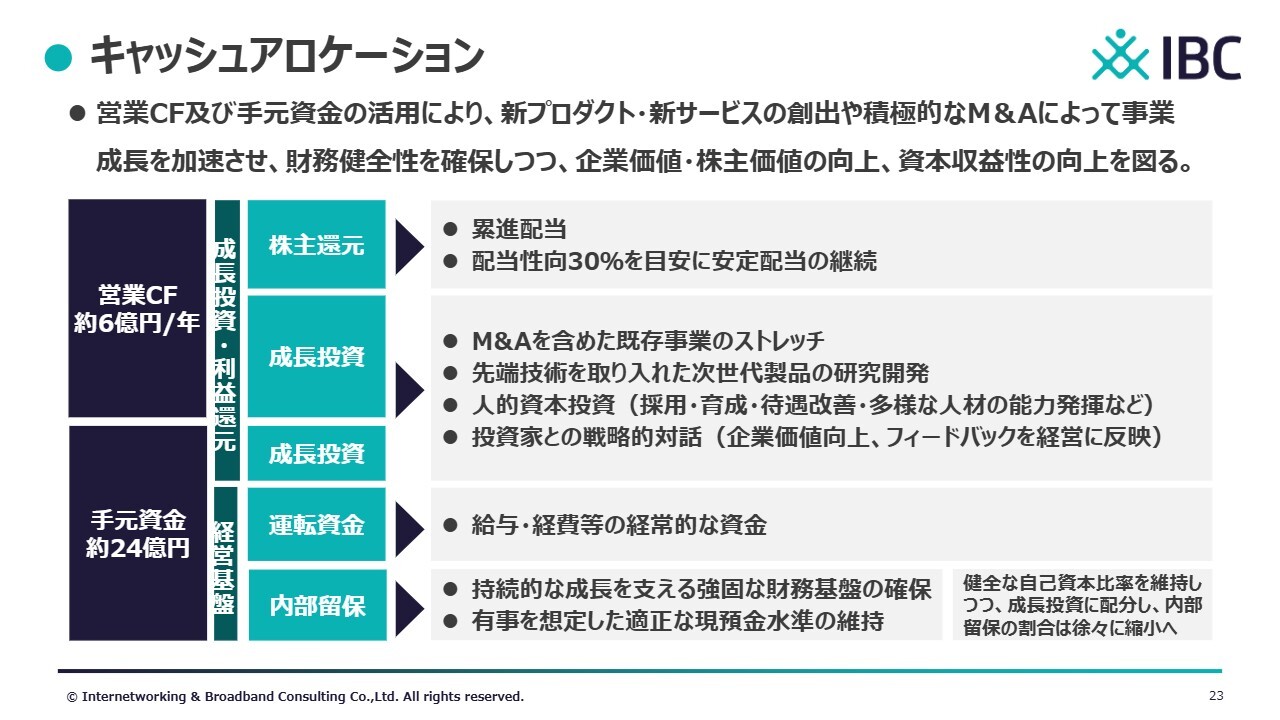 キャッシュアロケーションについてです。営業活動で得られた現金と手元資金を活用し、株主さまへの還元と成長投資を実施します。