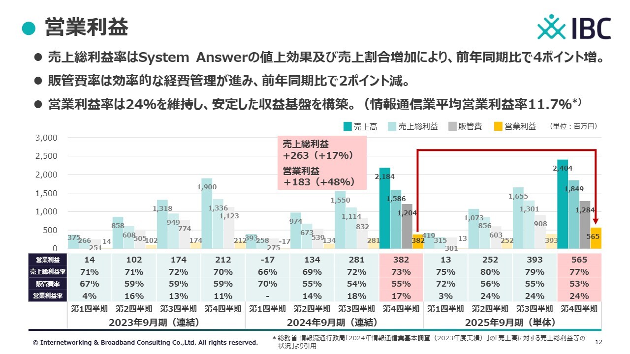 また、営業利益率は24パーセントとなり、当社が属する情報通信業界の平均営業利益率である11パーセントを大幅に上回る水準となりました。