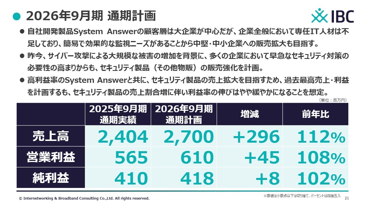これにより、高利益率の「System Answer」とともに、セキュリティ製品の売上拡大を目指し、過去最高の売上・利益を計画しています。ただし、セキュリティ製品の売上割合が増加することに伴い、全体の利益率の伸びはやや緩やかになると想定しています。