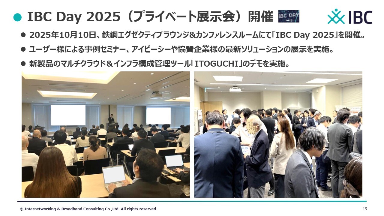 第4四半期のトピックスについてお話しします。2025年10月10日に「IBC Day 2025」を開催しました。多くのお客さまにご来場いただき、事例セミナーや最新ソリューションを紹介しました。また、新製品「ITOGUCHI」のデモを行い、大盛況のうちに終えることができました。