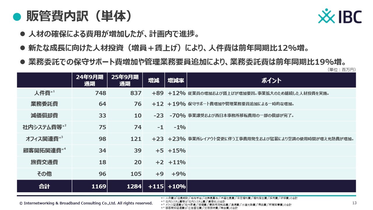 販管費は前年同期比で7パーセント増、単体では10パーセント増となっています。これは主に人件費で、賃上げや増員、業務委託の増加によるもので、事業拡大に伴う人材投資となります。