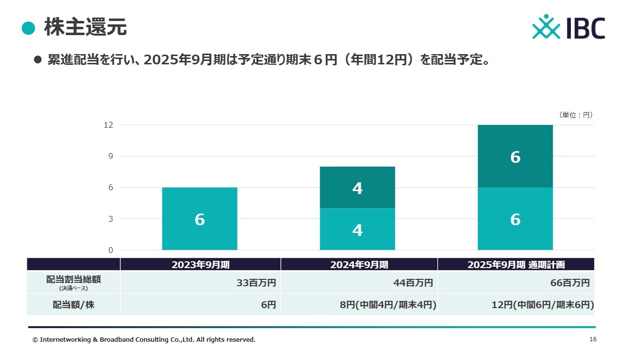 株主さまへの還元内容についてです。当社は累進配当を実施しており、2025年9月期は中間配当6円、期末配当6円とし、年間では12円の配当を予定しています。