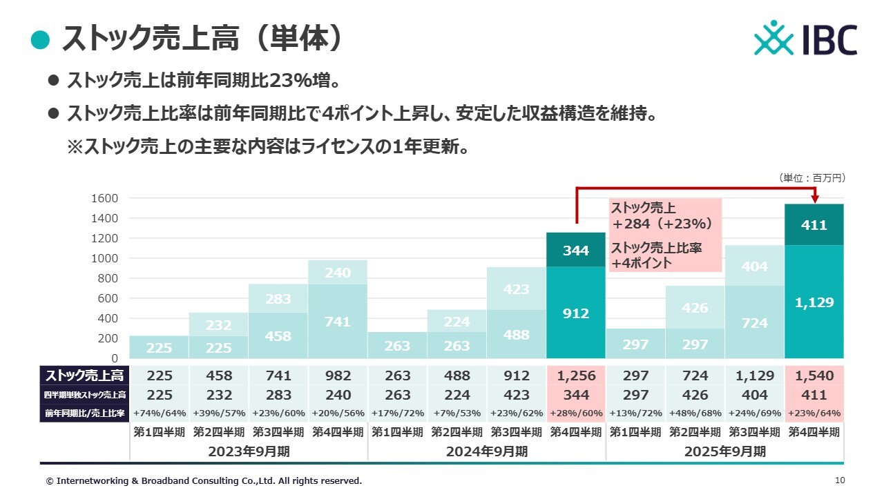 ストック売上高は前年同期比23パーセント増となり、高成長を維持しています。
