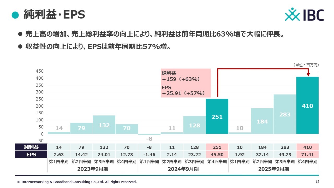 純利益は前年同期比63パーセント増の4億1,000万円、単体では78パーセント増となり、大幅に伸長しています。