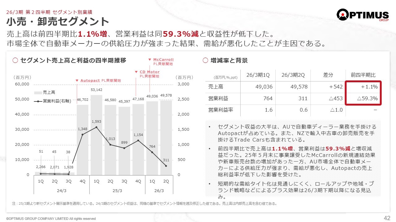 小売・卸売セグメントについて、小売の主要部分であり中心となるのは、新車販売事業Autopactです。現在、この状況下で必要性の高いM&Aを細かく取り込みながら成長を遂げています。