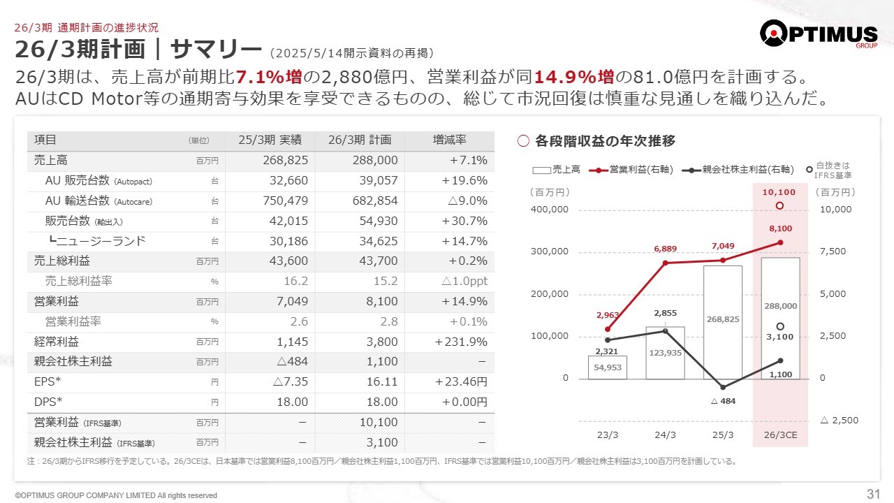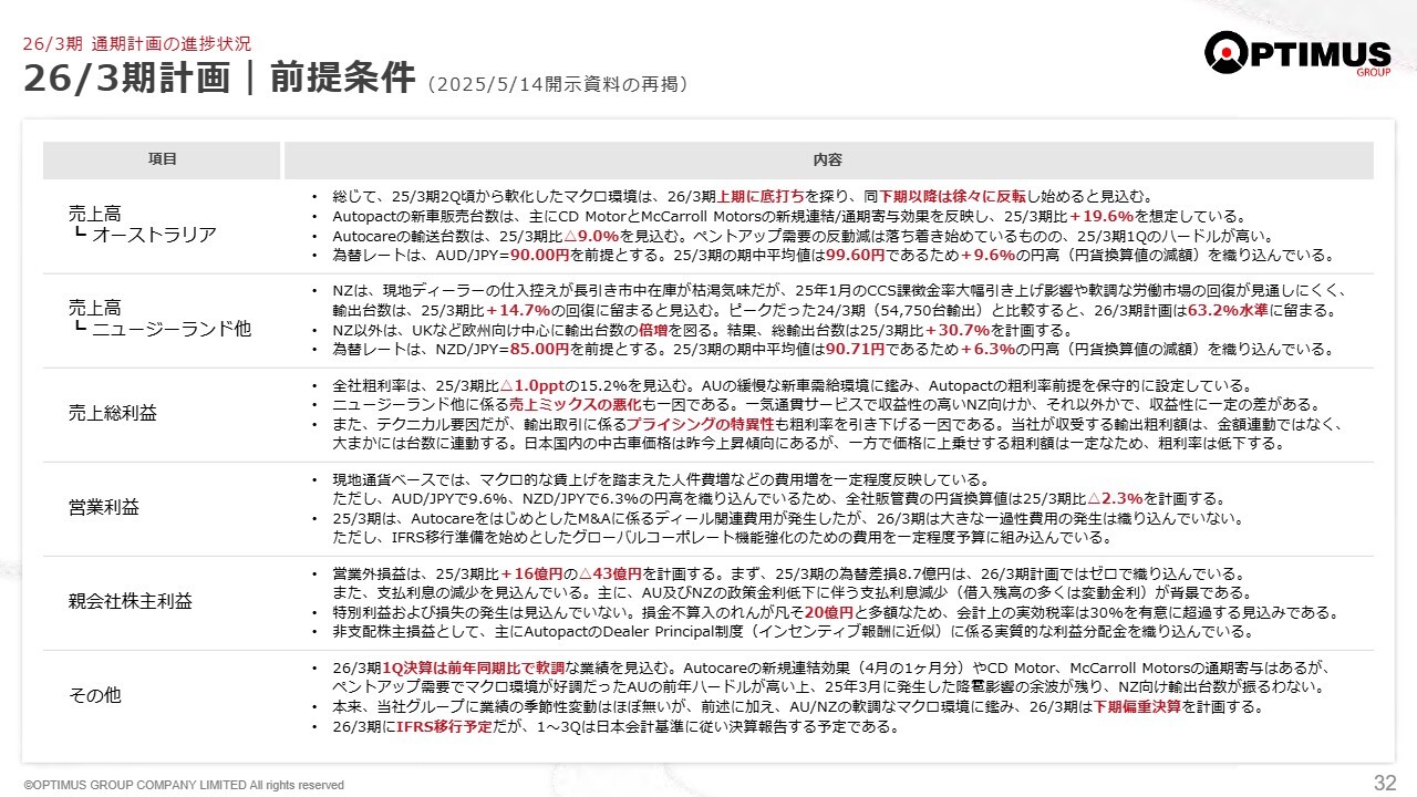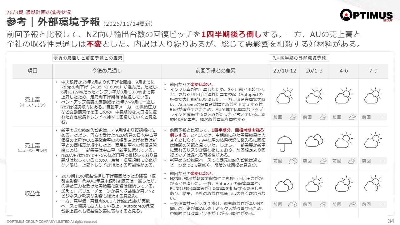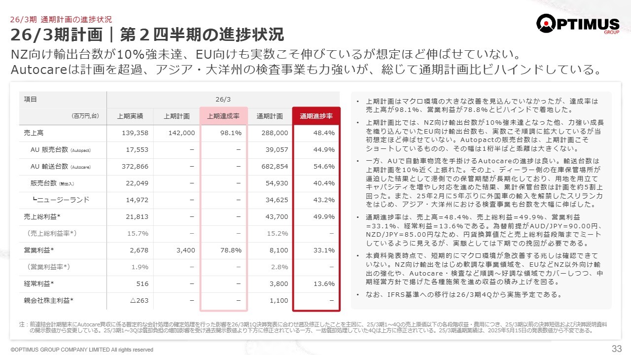 2026年3月期計画の進捗に関し、私からレビューさせていただきます。すでにお伝えしたとおり、上半期は期初の想定より厳しい事業環境でした。しかし、オーストラリアでは販売台数を維持でき、輸出を起点とするバリューチェーンの従来型モデルにおいては、ニュージーランドの落ち込みを他の国への輸出で補う効果が少しずつ現れています。