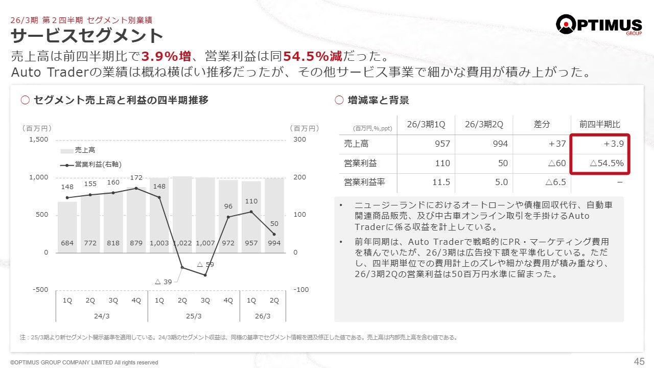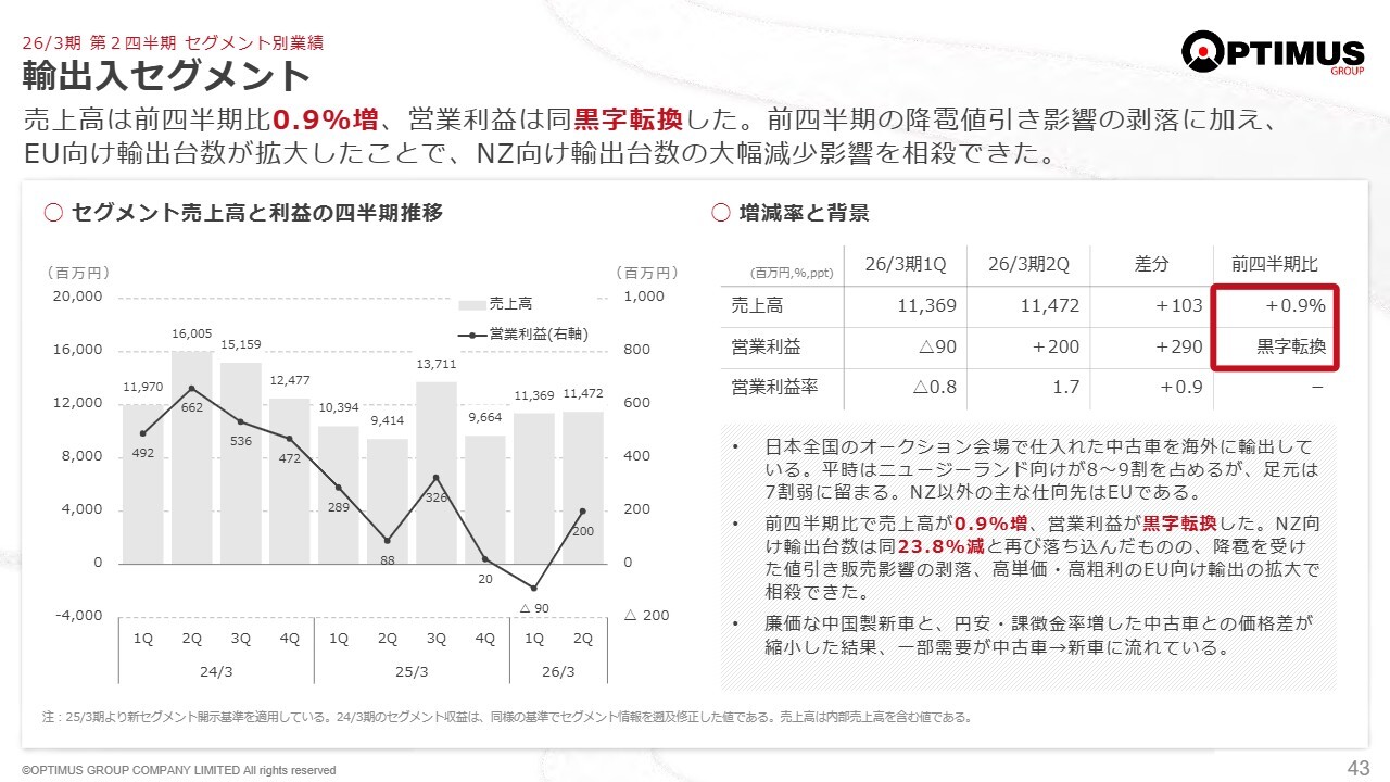 上半期において、Autopactの売上高は堅調に推移しました。一方で、中古車輸出では主力のニュージーランド向けが大きく落ち込みましたが、損益面ではその他地域向けで若干持ち直しました。