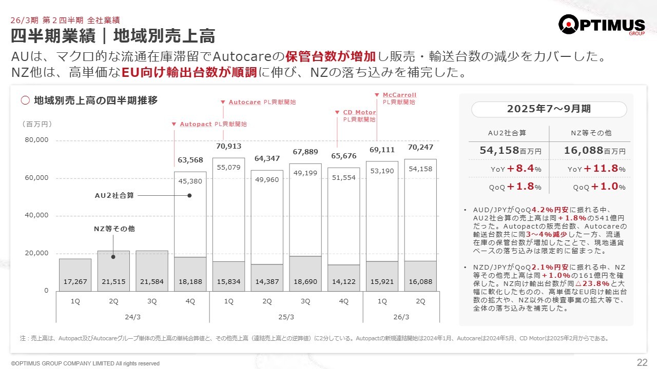 スライドには、地域別の売上高が示されています。売上高は、オーストラリアの主要2社であるAutopactとAutocareと、それ以外に分けていますが、この主要2社は売上高が堅調に推移しました。