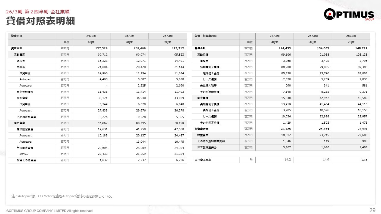 Autopactを買収する前には自己資本比率30パーセントぐらいをターゲットにしていたのですが、かなり今は自己資本比率が低いです。これは同社が想定どおりに利益を生まなかったことが影響していますが、本来のかたちであれば、数年以内にすべて解消できるよう予定していました。